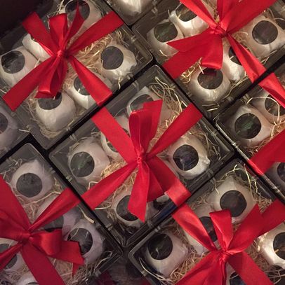Bath Salt & Bath Bomb Gift Sets contain dark bamboo basket and red ribbon. Perfect for special occasions or holiday events!